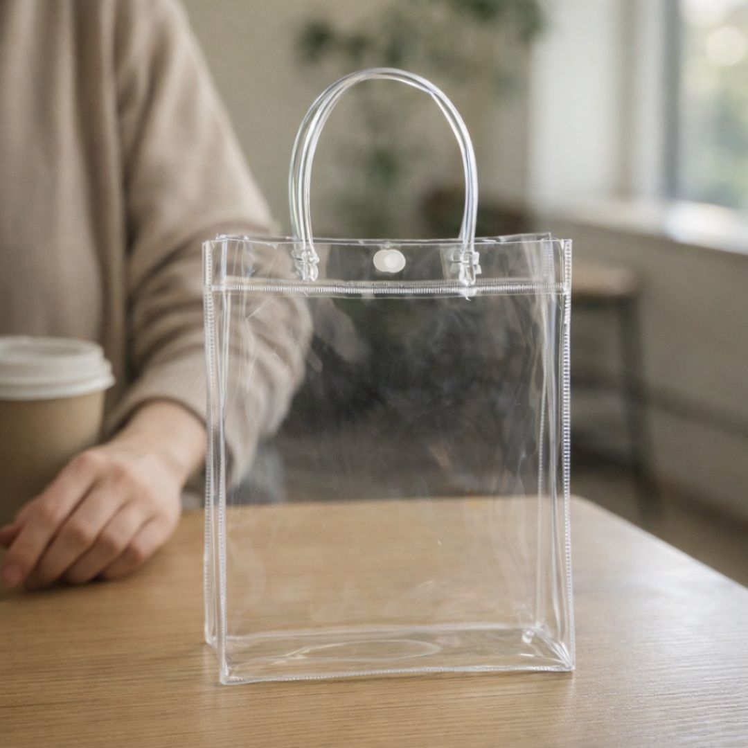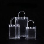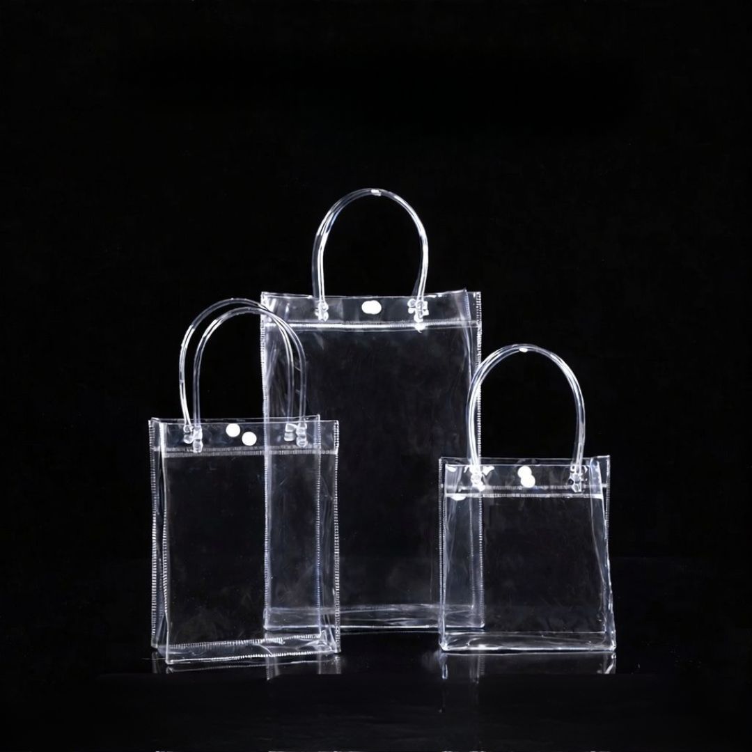 Bolsa transparente de PVC con asas rígidas, ideal para regalos, exhibición y empaque de productos. Disponible en varios tamaños para tiendas, eventos y emprendimientos.