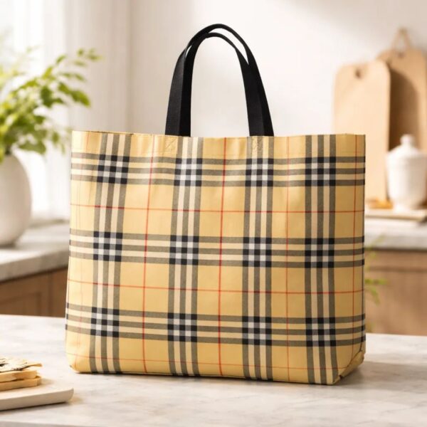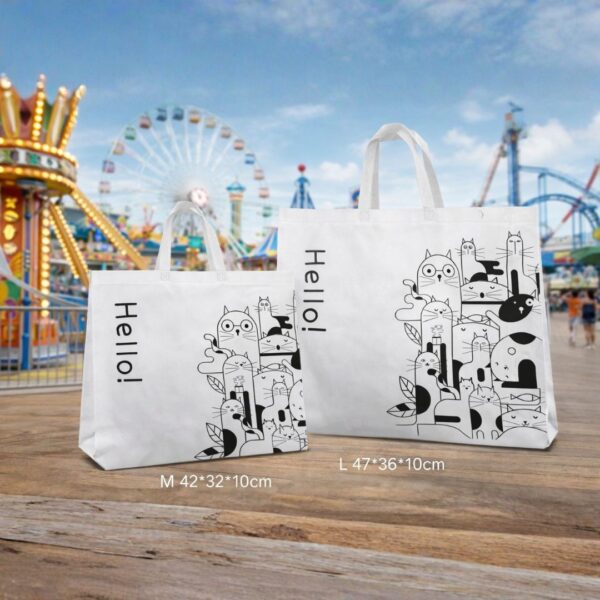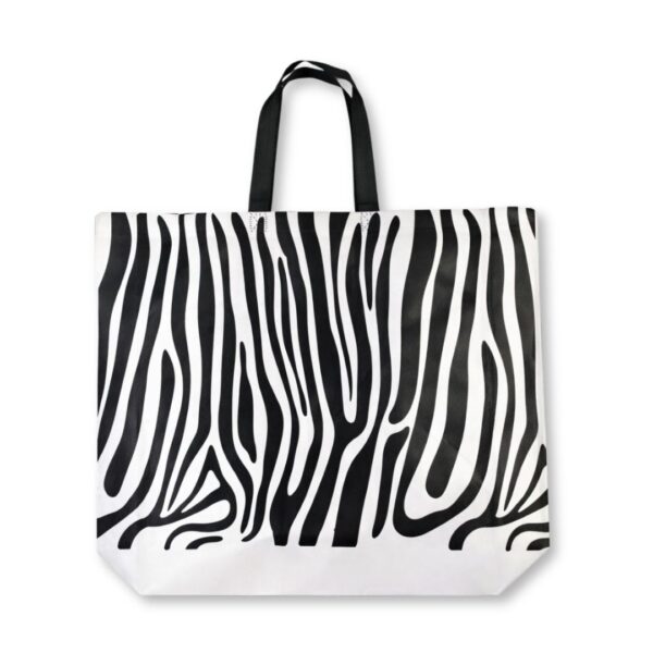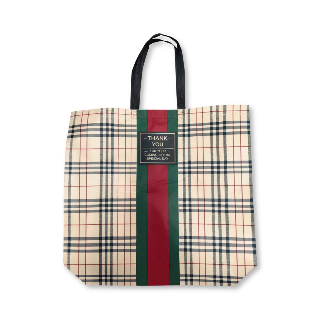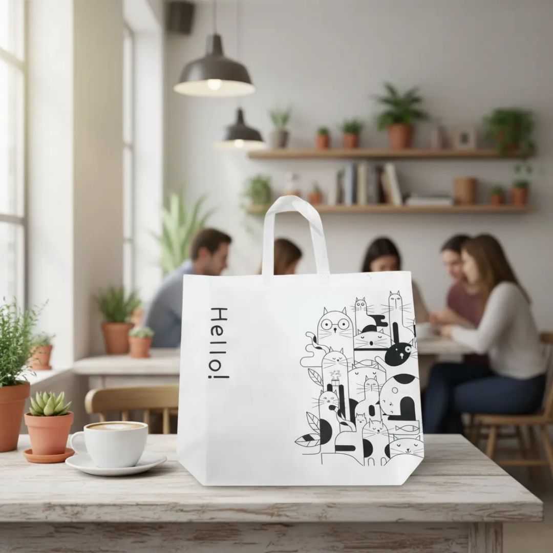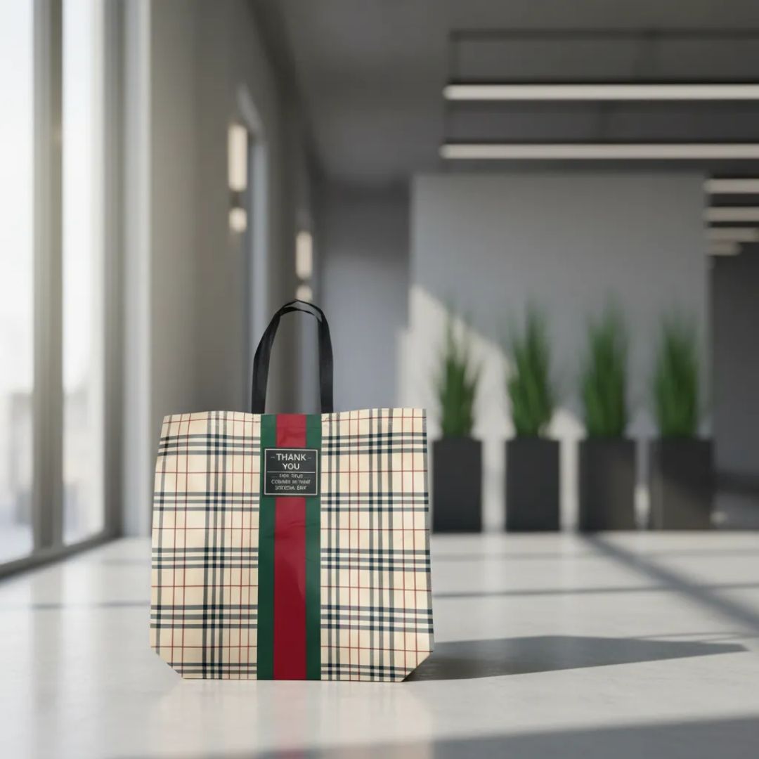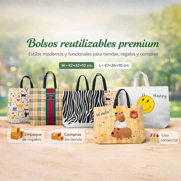 Bolsa reutilizable premium con asas, ideal para tiendas, regalos y compras. Disponible en dos tamaños y con diseños modernos para una mejor presentación.
