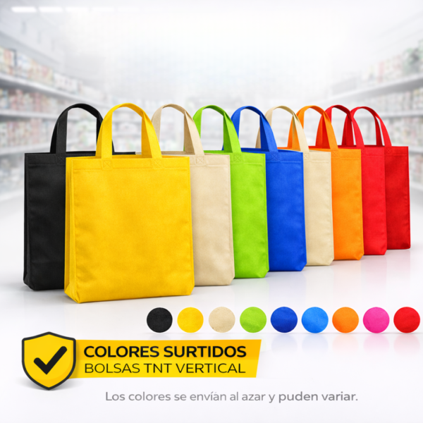 Bolsa vertical TNT reutilizable en colores surtidos, ideal para compras, ferias, regalos, retail y entregas. Práctica, ligera y funcional para uso comercial o diario.