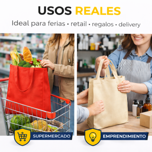 Es ideal para transportar productos, regalos, folletos o compras, manteniendo una presentación limpia y ordenada. Está dirigida a negocios, emprendedores, ferias, eventos y personas que buscan una opción reutilizable y ligera para el día a día.