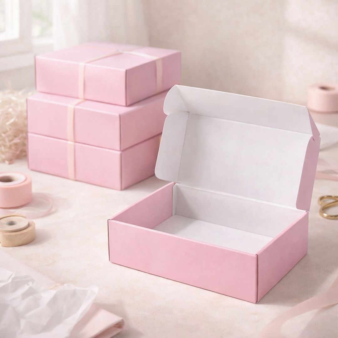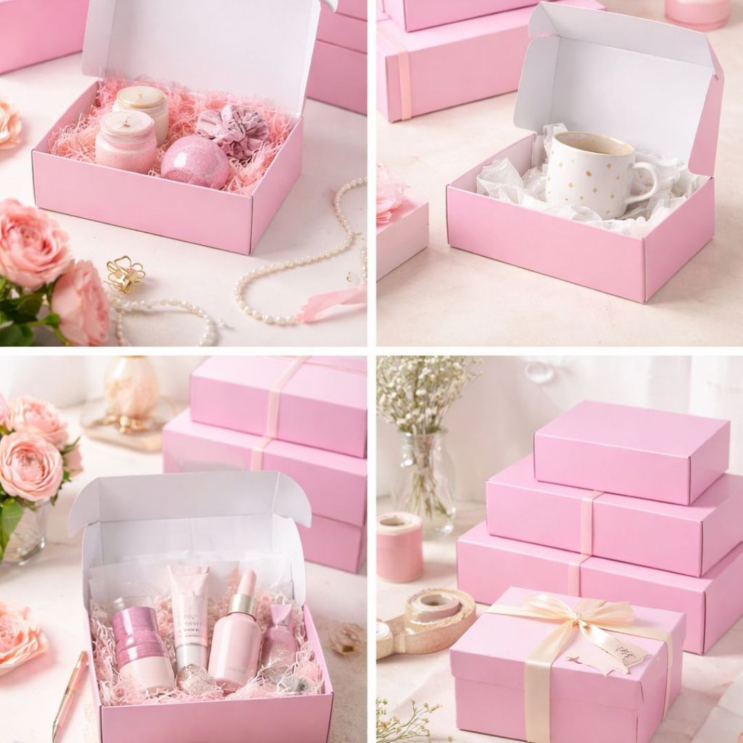 Su apariencia en tono rosado pastel aporta una presentación suave, elegante y versátil, adecuada para cosmética, accesorios, tazas, velas, kits de regalo, papelería y artículos pequeños o medianos. Están dirigidas a tiendas, marcas, repostería creativa, emprendimientos de regalos y ventas online que buscan una caja útil y con mejor impacto visual.