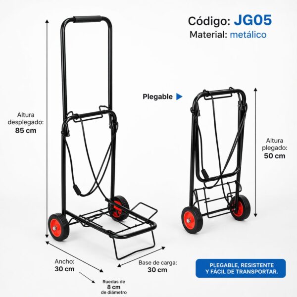Carro de carga plegable fabricado en estructura metálica, diseñado para facilitar el traslado de bolsas, paquetes, botellas, cajas y productos de uso diario. Su formato compacto y liviano permite mover carga de manera más cómoda en el hogar, comercios, oficinas o durante compras frecuentes.