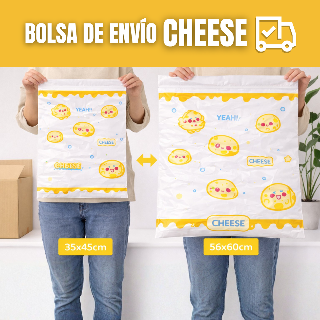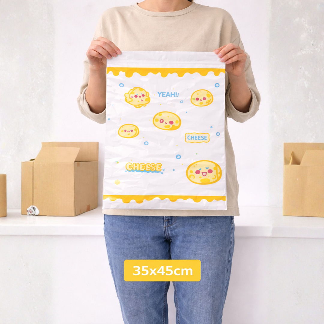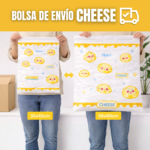 Bolsas de envío courier con diseño Cheese y cierre autoadhesivo, ideales para ecommerce, tiendas online y emprendimientos que buscan proteger sus paquetes con una presentación práctica, resistente y llamativa.