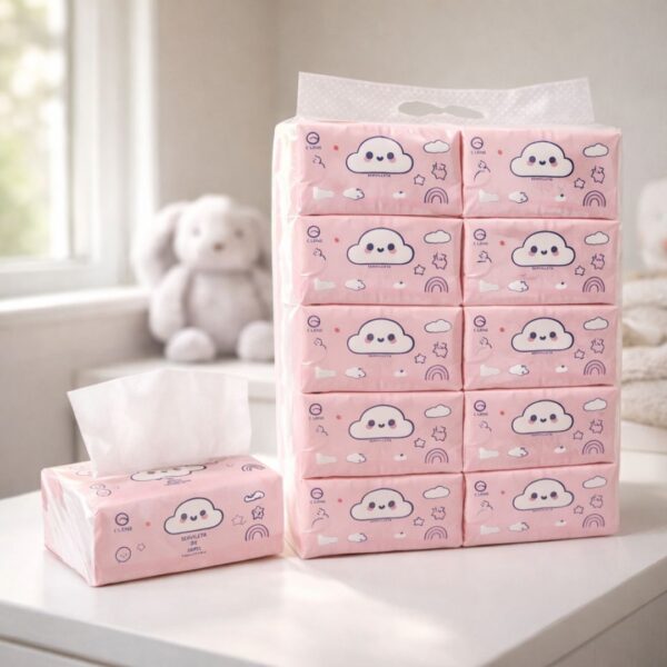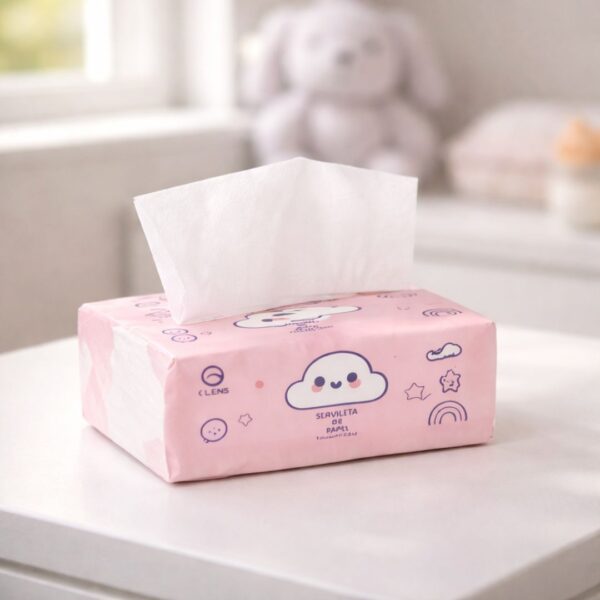 Servilleta de papel facial en paquete con diseño estampado de nube y presentación práctica para dispensar fácilmente. Está elaborada en papel de apariencia suave y resistente, pensada para acompañar el uso diario en el hogar, dormitorios, escritorios, salas de espera, oficinas o espacios infantiles. Su formato compacto permite ubicarla cómodamente sobre mesas, veladores o escritorios, brindando una solución higiénica y funcional para limpieza facial, manos o pequeños usos cotidianos.